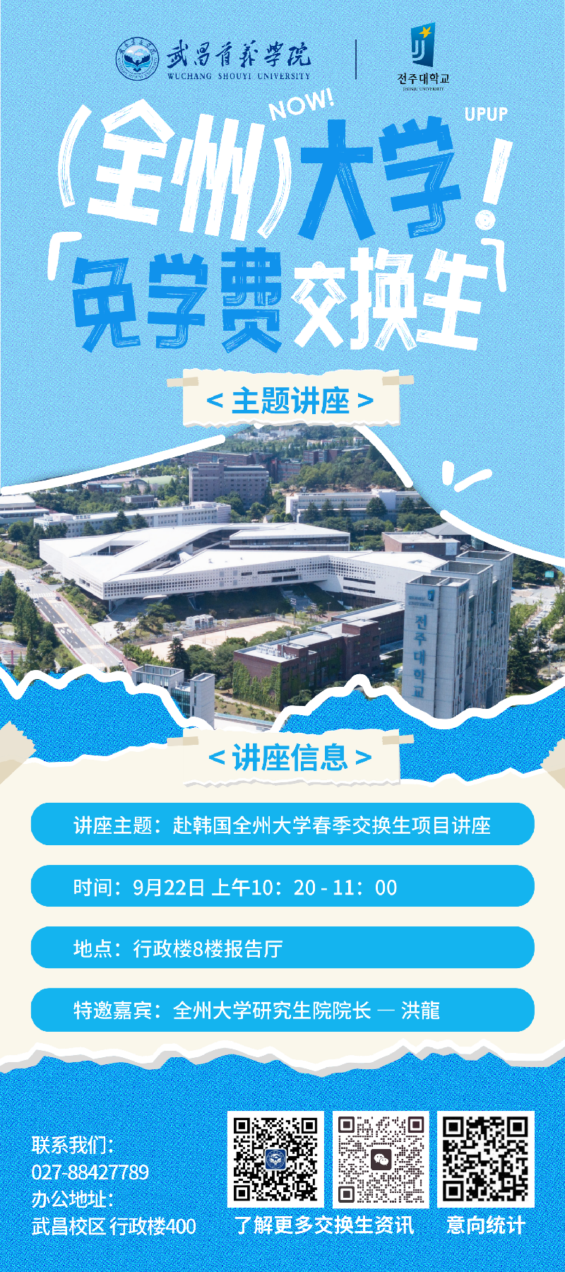 为给我校学生提供更多赴韩留学深造机会,特邀请韩国全州大学研究生院洪龍院长来校就2026年春季赴韩国全州大学交换生项目及升学等相关事宜宣讲,欢迎同学们踊跃参加!