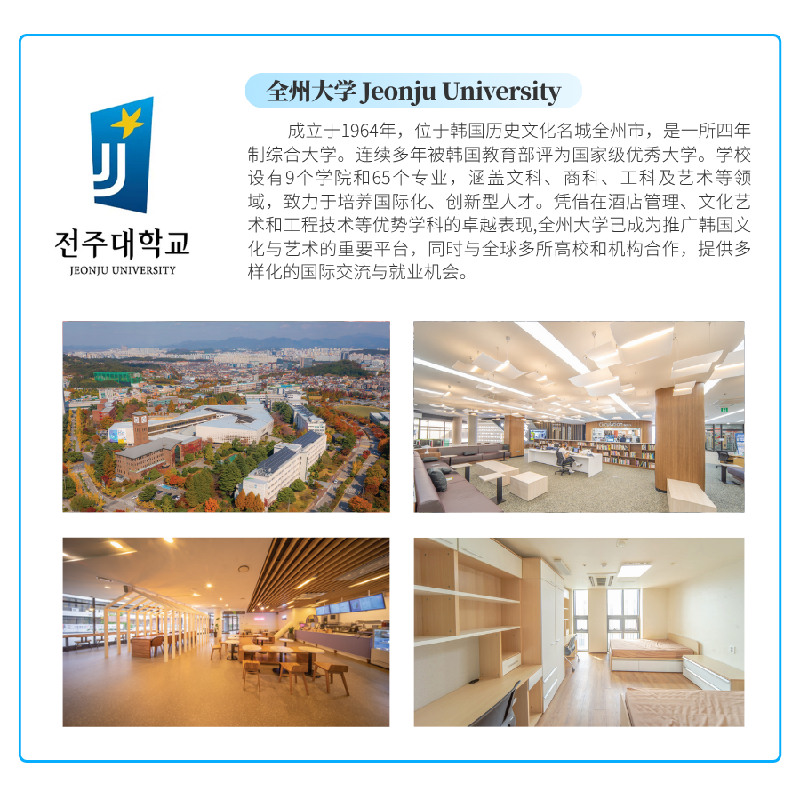 为给同学们提供更多海外学习和交流的机会,提升跨文化沟通能力和国际竞争力,根据我校与韩国全州大学合作交流协议,现启动2026年春季赴韩国全州大学交换生项目。通过该项目,学生有机会在全州大学学习一学期,体验当地文化,结识来自不同文化背景的同学,丰富国际化学习经历。现将相关事项通知如下: